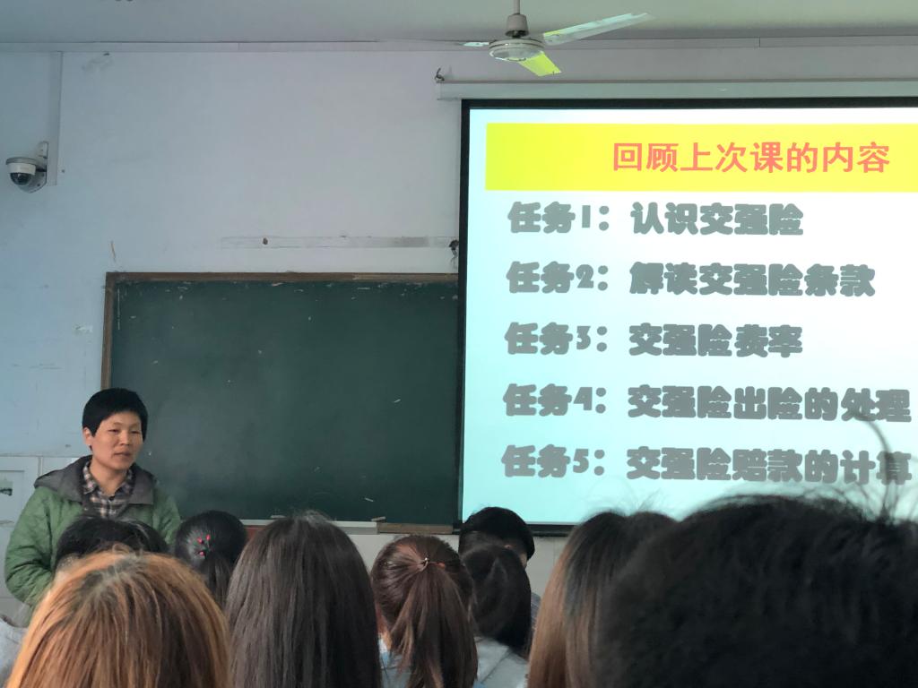 本次教学观摩课由汽车营销教研室刘阳教师主讲,课程为《汽车保险与理赔》,主要讲授机动车商业保险产品知识。刘老师首先回顾上次课的内容,然后以案例教学的方式导入了商业险的常见险种,接下来回顾了商业险的政策演变历史,随后阐述了机动车保险的保险责任、责任免除、保险额度和赔偿处理等知识,并以大量的案例与学生进行了互动,重点讲述了交强险、三责险、盗抢险等常见险种的出险及理赔要点。
