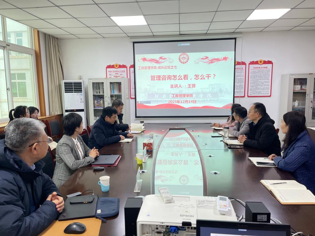 为进一步突出学校应用型人才培养特色,扎实推进产教融合协同发展,提升学院教师社会服务能力,12月14日下午,北京和君咨询合伙人、河南省分公司总经理王晋受邀莅临我院作“管理咨询怎么看,怎么干?”专题报告。北京和光天翊河南公司总经理张莹、院长贾宪军、副院长陈先锋、“应用性科研”驱动产教融合与课程建设项目团队成员、部分教师和学生代表参加报告会。会议由副院长陈先锋主持,通过腾讯会议和现场会议同步进行。