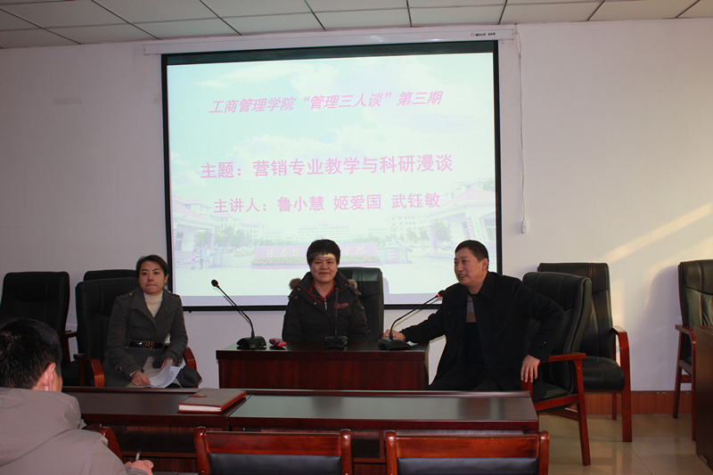 为营造浓厚的学术氛围,进一步提升老师们的教学水平和激发老师们的科研激情,ok138cn太阳集团529结合工作实际,邀请鲁小慧教授、姬爱国副院长、营销教研室主任武钰敏老师于12月28日下午在院会议室成功举办第三期“管理三人谈”。本期主题为“营销专业教学与科研漫谈”,论坛由我院副院长姬爱国主持。