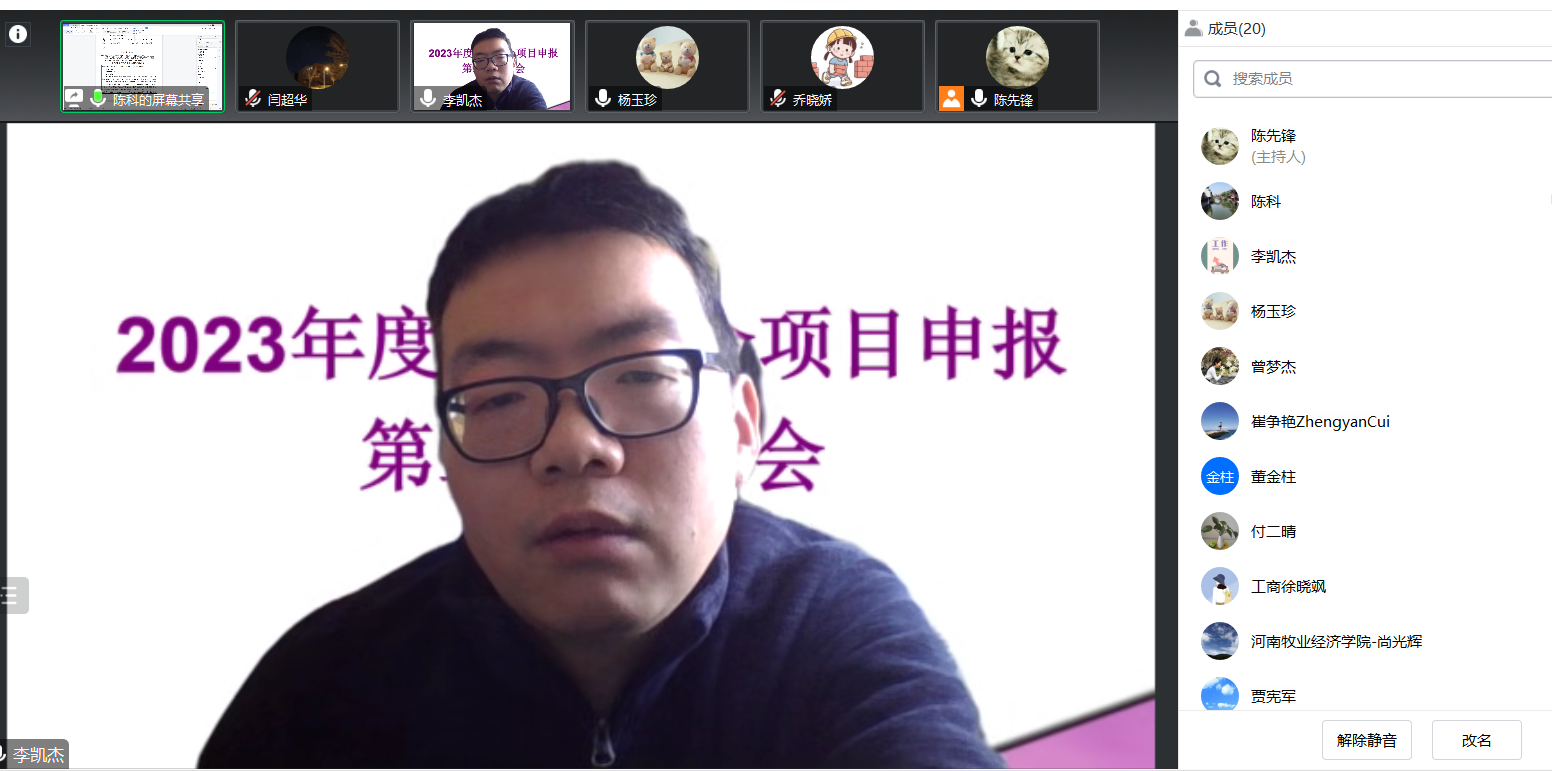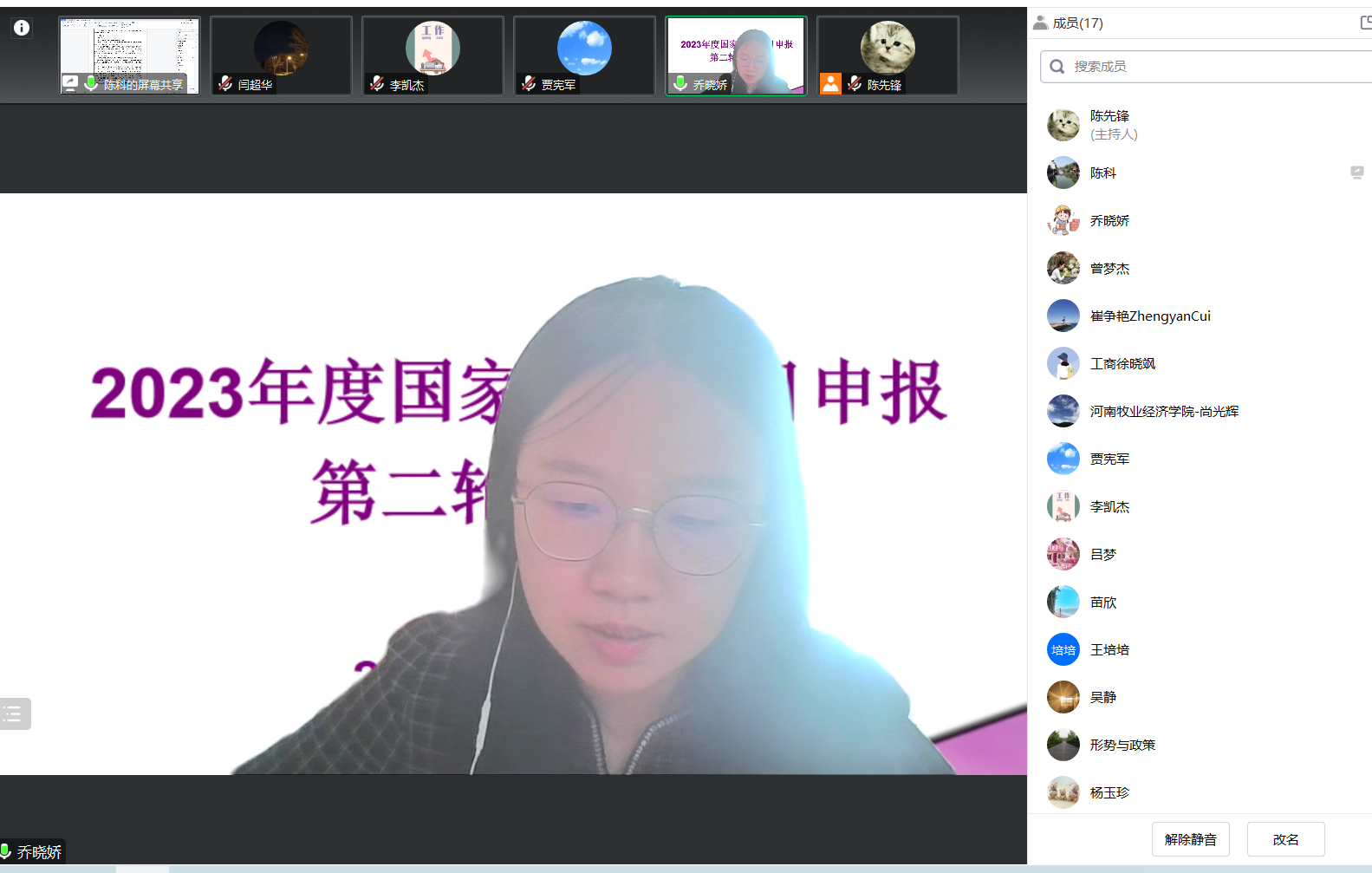 为进一步提升老师们的科研水平,提高国家基金项目申报质量,2月3日上午,ok138cn太阳集团529“成长论坛”暨2023年度国家基金项目申报第二轮论证会于线上举行。本次论证会邀请河南师范大学人力资源部部长、商学院原院长杨玉珍教授、天津理工大学管理学院副教授、保险学系系主任乔晓娇博士和河南财经政法大学副教授、《经济经纬》编辑部副主任李凯杰博士三位专家在线指导。ok138cn太阳集团529全体博士及学院和我校其他部门部分教师参加论证会。论证会由ok138cn太阳集团529副院长陈先锋主持。