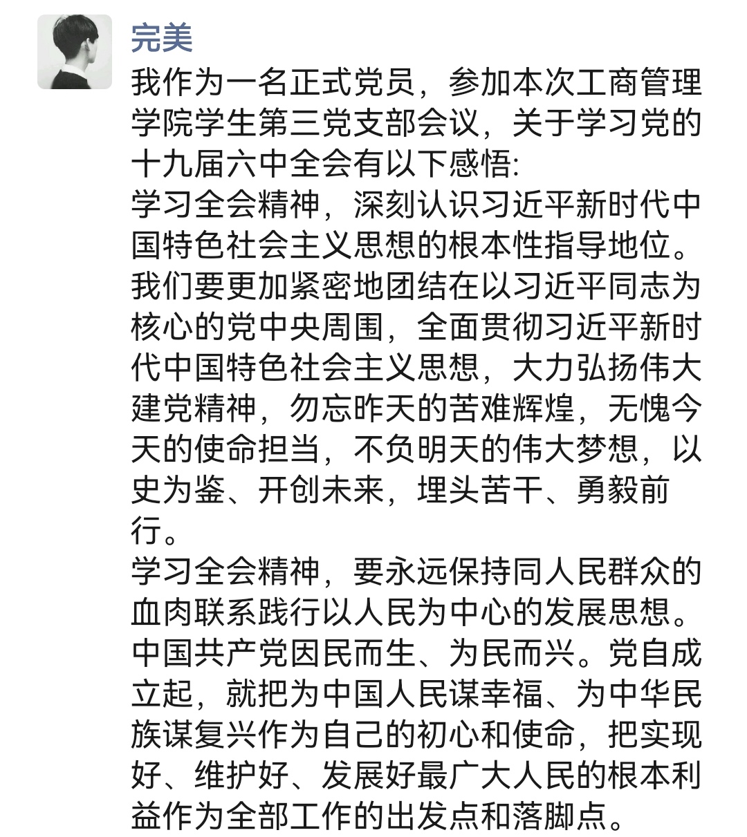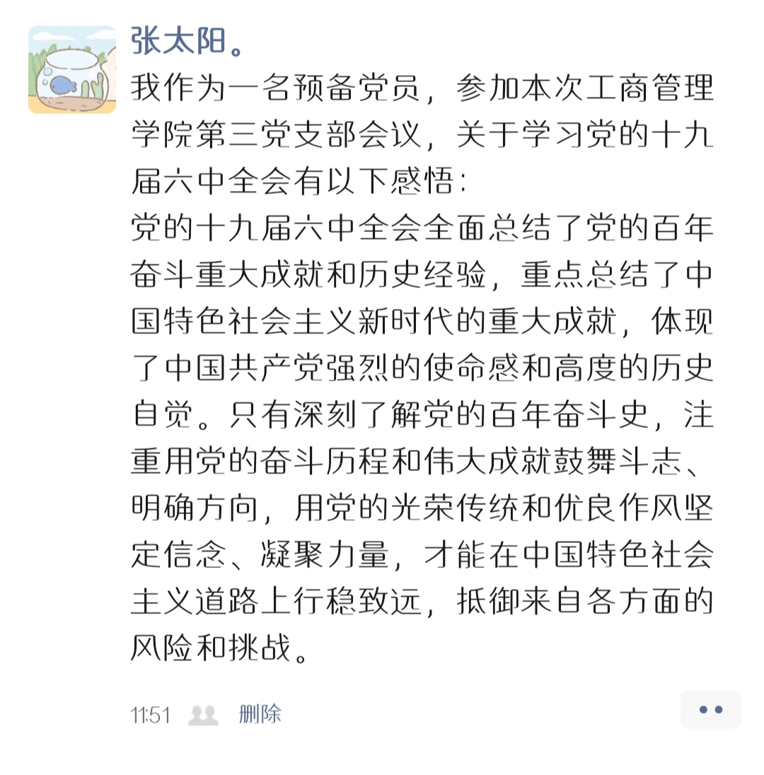 党的十九届六中全会召开以来,ok138cn太阳集团529学生第三党支部党员严格执行校党委和院党委的工作部署和安排,认真落实把学习好、宣传好、贯彻好党的十九届六中全会精神作为当前和今后一个时期的首要政治任务,在学生支部召开十二月份主题党日活动后,更是周密部署、精心组织,迅速在全院学生党员、青年团员中掀起学习贯彻全会精神热潮,持续推动党的十九届六中全会精神在祖国各地落地生根。学生党员纷纷发表朋友圈,通过这种方式,亮身份、表决心、担使命、勇冲锋、若需要,必向前,荣党旗,展风采,表达了我院学生党员在辞旧迎新时刻,始终不渝坚持在党中央的领导下,树牢“四个意识”坚定“四个自信”,坚决做到“两个维护”,勇于担当作为,以求真务实作风把党中央和校党委的决策部署落到实处,和祖国各族人民一道,祛病疫、促生产、严防控、互支持、共呼吸、同命运、心相连、壮国威,让五星红旗永远飘扬在湛蓝色天空的决心。