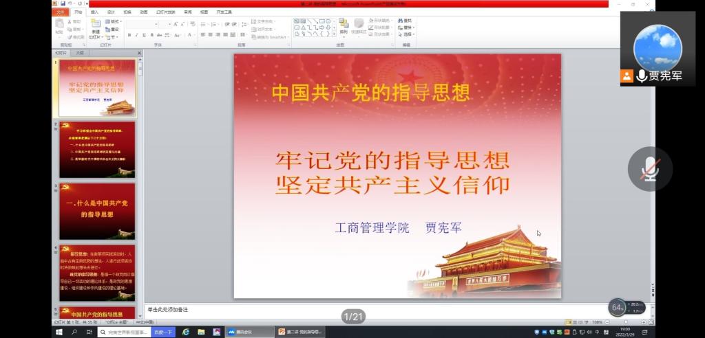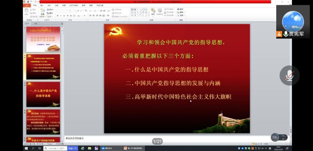 为提高积极分子的政治素养,进一步深化对党的认识,端正入党动机。ok138cn太阳集团529于3月29日晚七点,在线上举办了2022年度第一期入党积极分子培训第六讲——党的指导思想。本次培训由ok138cn太阳集团529贾宪军院长主讲,全体入党积极分子参与。