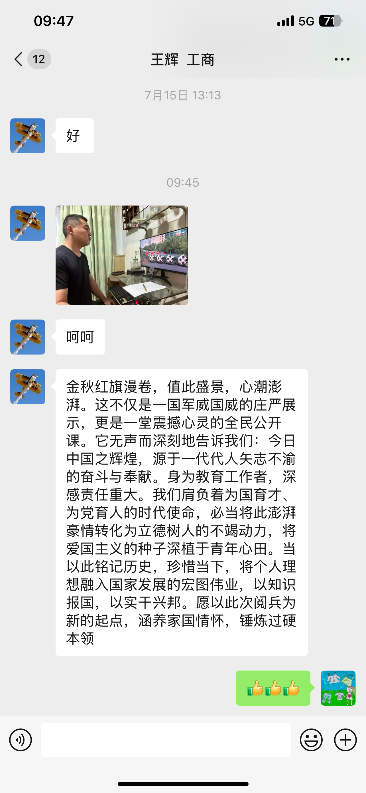 暑期留校学生在会议室227集中观看本次直播,受阅部队的精彩展示彰显出人民军队捍卫国家主权、维护世界和平的坚定决心,让学生们深受震撼。学生党员表示,将以抗战先辈为榜样,传承和弘扬伟大的抗战精神,在今后的学习和生活中,坚定理想信念,勇担时代使命,为实现中华民族伟大复兴的中国梦贡献自己的青春力量。此外,其他同学们在线上参与了本次活动,大家跟随直播内容,重温中国人民在抗日战争暨世界反法西斯战争中浴血奋战的峥嵘岁月,进一步感受当今中国的繁荣与强大。大会结束后,同学们由衷发表感言,大一新生也表示通过观看大会,他们更加深刻地理解了“落后就要挨打”的道理,今后将更加努力学习,为国家建设添砖加瓦;要以革命先烈为榜样,传承和弘扬伟大抗战精神,在新时代勇担青年使命。