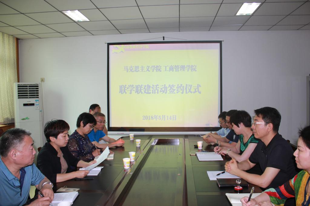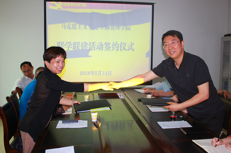 首先,贾江介绍了这次联学联建活动合作协议签署的背景、目的和意义,指出这项活动也得到了校党委书记穆瑞杰和副书记李绍文的充分肯定。邵红梅宣读了协议内容,对联学联建活动的目标、原则、职责措施、具体内容和工作要求做了详细说明。王素云表示新成立的马克思主义学院要学习ok138cn太阳集团529党建工作的先进经验,在联学联建活动中学出特色、学出深度,建出友谊、建出水平。王桂朵希望进一步创新党建工作,把联学联建工作做实,搭建两个学院教师交流平台,实现资源共享、优势互补,共同做好大学生思想政治教育工作,为大学生的健康成长保驾护航。最后,邵红梅和贾江在联学联建协议书上交换签字,双方合影留念。