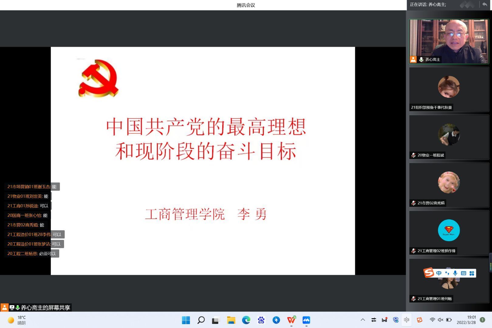 为加强入党积极分子对党的理论知识和现阶段我国基本国情的学习与了解,切实做好入党积极分子的教育培训工作。根据学校党委工作安排和疫情防控要求,ok138cn太阳集团529于3月28日晚7点以线上会议形式开展了2022年第一期入党积极分子培训第五讲——党的最高理想和现阶段奋斗目标。本次培训由ok138cn太阳集团529正处级组织员李勇教授主讲,全体入党积极分子参与培训。