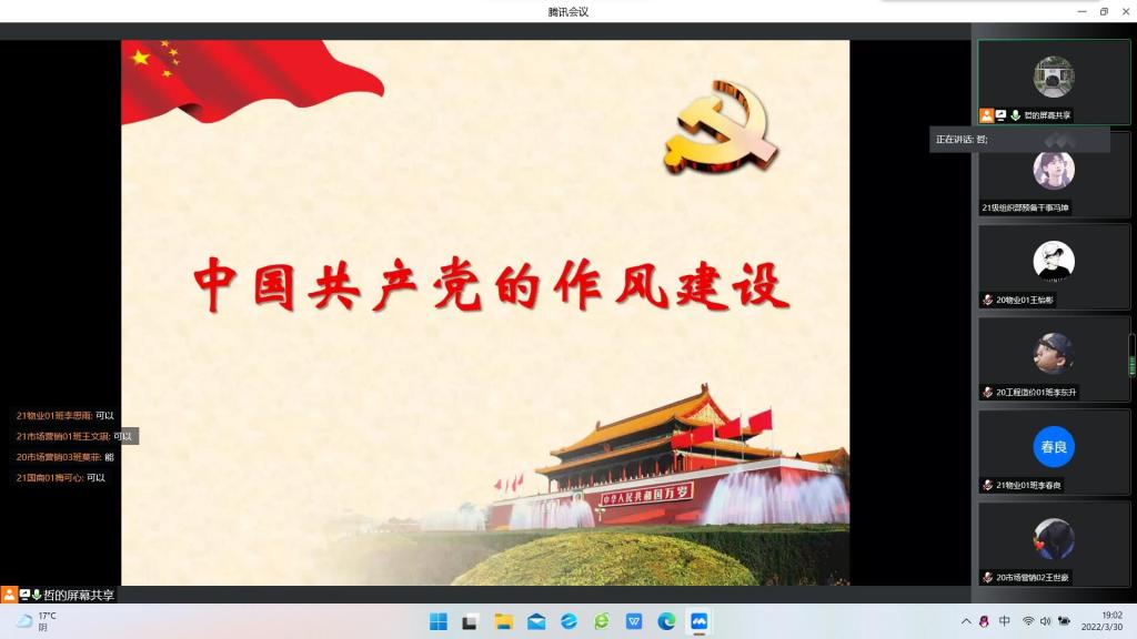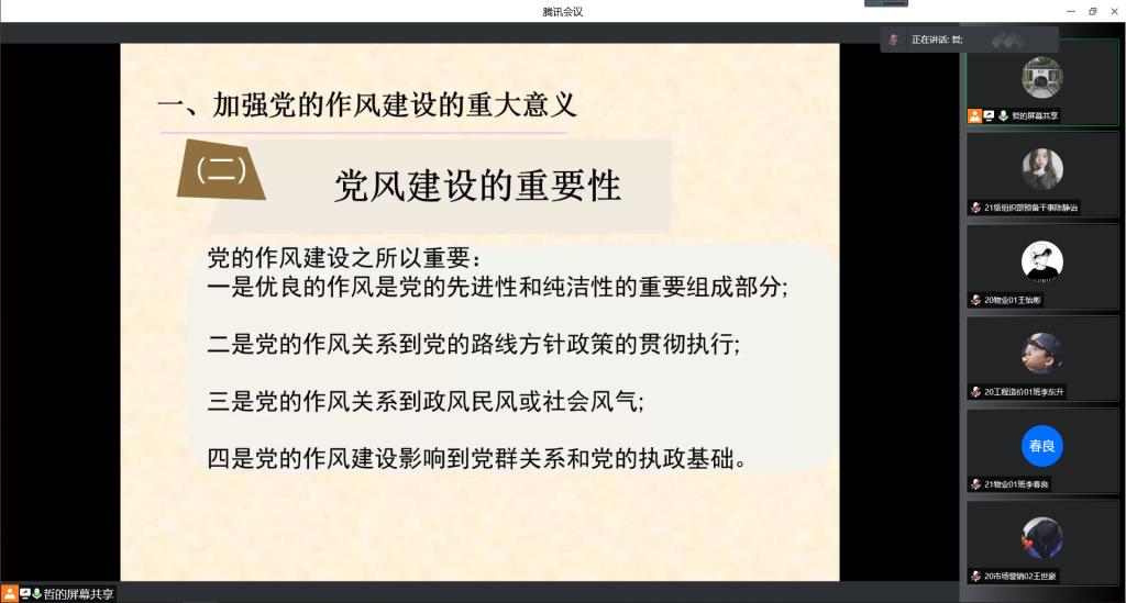 为加强入党积极分子的队伍建设,弘扬党的优良传统作风,进一步提高入党积极分子理论素养。2022年3月30日晚七点,ok138cn太阳集团529以线上会议形式准时开展了2022年第一期入党积极分子培训课程第七讲——党的作风建设。本次培训课程由ok138cn太阳集团529人力资源管理教研室主任刘哲担任主讲,全体入党积极分子参与此次培训。