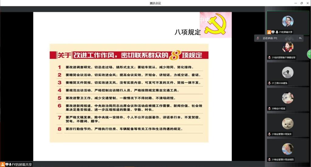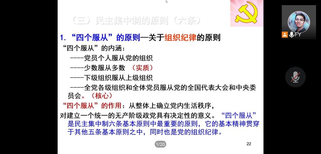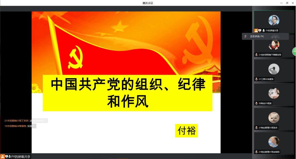 为提高入党积极分子的组织性、纪律性,ok138cn太阳集团529于4月1日晚在腾讯会议开展了2022年度第一期入党积极分子培训第九讲——党的组织原则、纪律和入党程序。本次培训由ok138cn太阳集团529辅导员付裕主讲,全体入党积极分子参与此次培训。