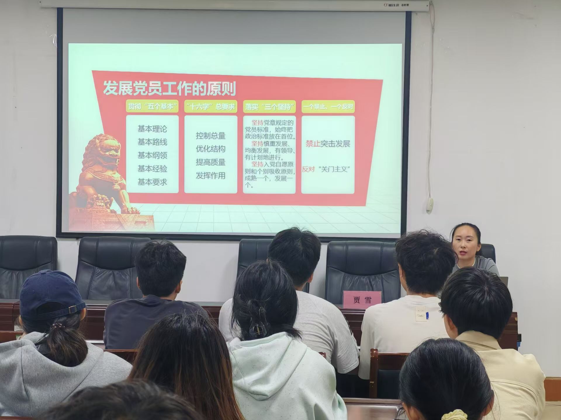 党课伊始,贾雪紧扣党员发展流程这一核心,从“申请入党”、“确定培养入党积极分子”、“确定考察发展对象”、“接收预备党员”、“预备党员转正”五个阶段详细介绍了大学生入党的基本流程和注意事项,使入党积极分子对入党条件及流程有了更深层次的了解。随后,贾雪指出作为一名入党积极分子,一定要清楚了解和掌握入党条件和发展党员标准,要自觉对照党章要求,端正入党动机,做到从根本上了解党。最后,贾雪强调入党流程需严格按照规定进行,鼓励入党积极分子要积极参加党课学习和实践活动,不断提高自身的政治素养和思想认识。