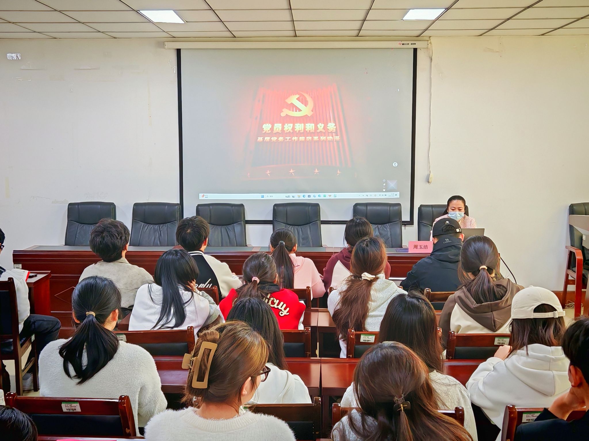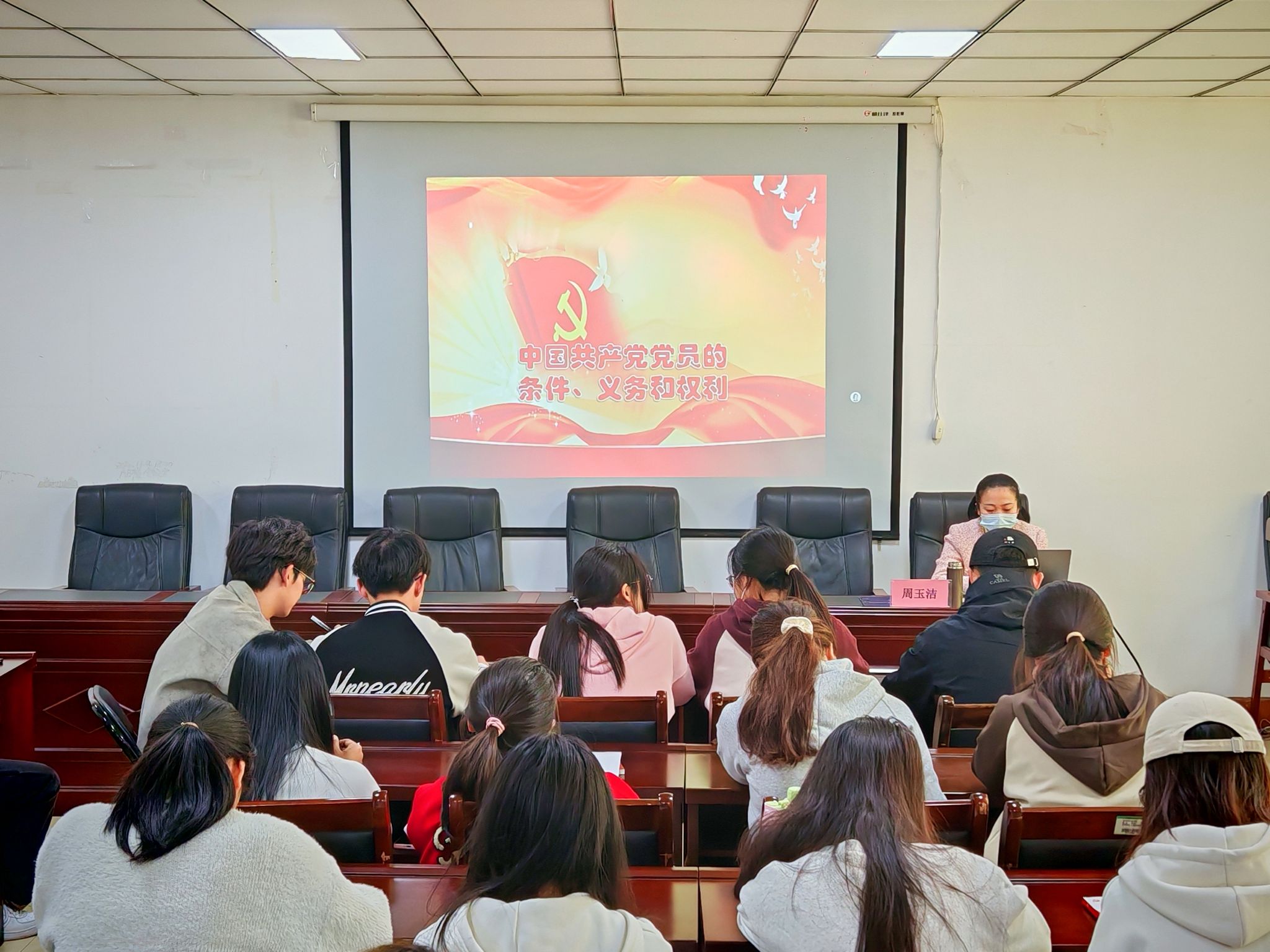 党课伊始,周玉洁以组织积极分子观看视频的形式引入党员的权利和义务的重要性,告诫入党积极分子们要忠贞不渝、永不叛党。随后,周玉洁重点围绕“申请入党的条件和成为中国共产党党员的基本条件、党员的义务和党员的权利、党员义务与权利之间的主要关系、党员如何正确履行义务和行使权利”等方面进行全面讲解。最后,周玉洁结合大学生思想实际,呼吁入党积极分子应明确当代大学生的责任和使命,明确新时代党员权利和义务的要求,不断汲取优秀共产党员的榜样力量,矢志不渝,砥砺奋进。