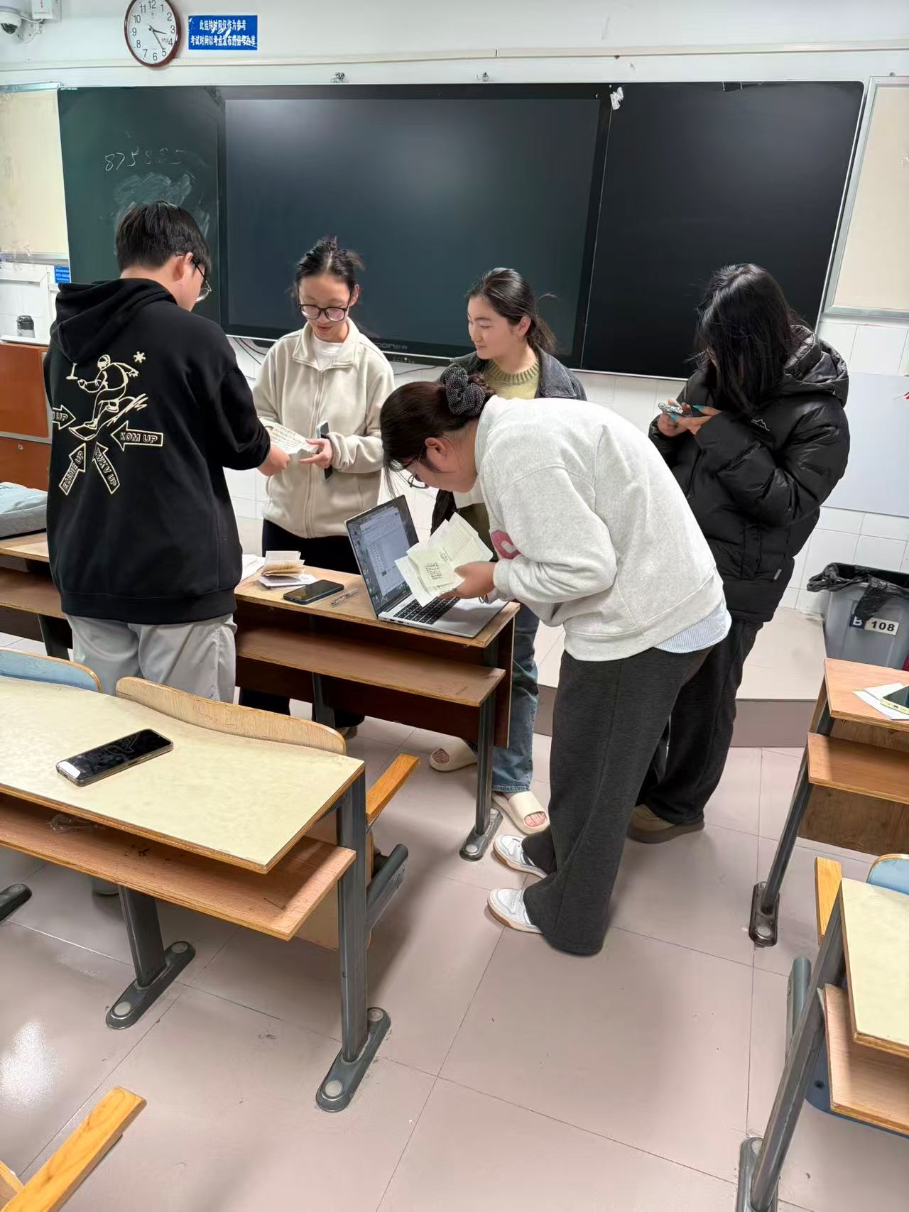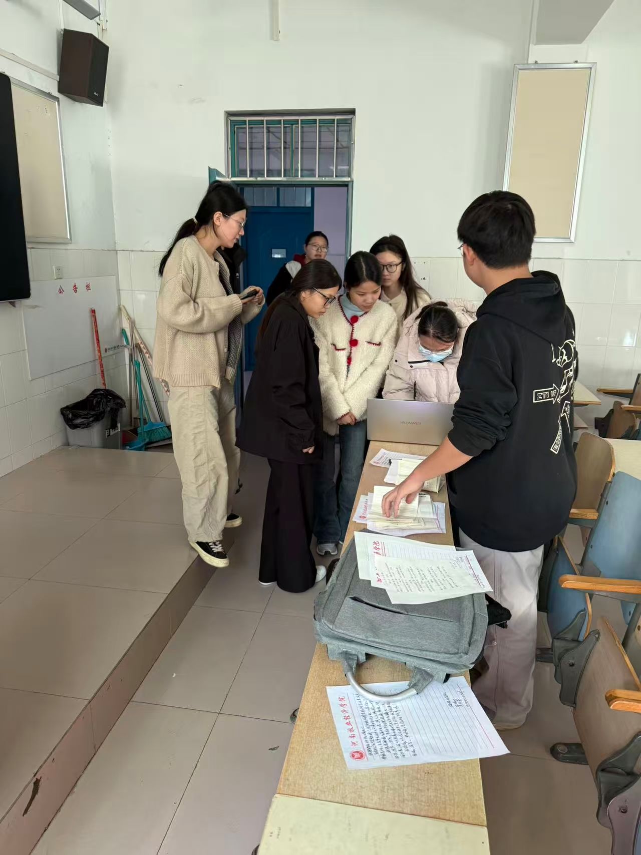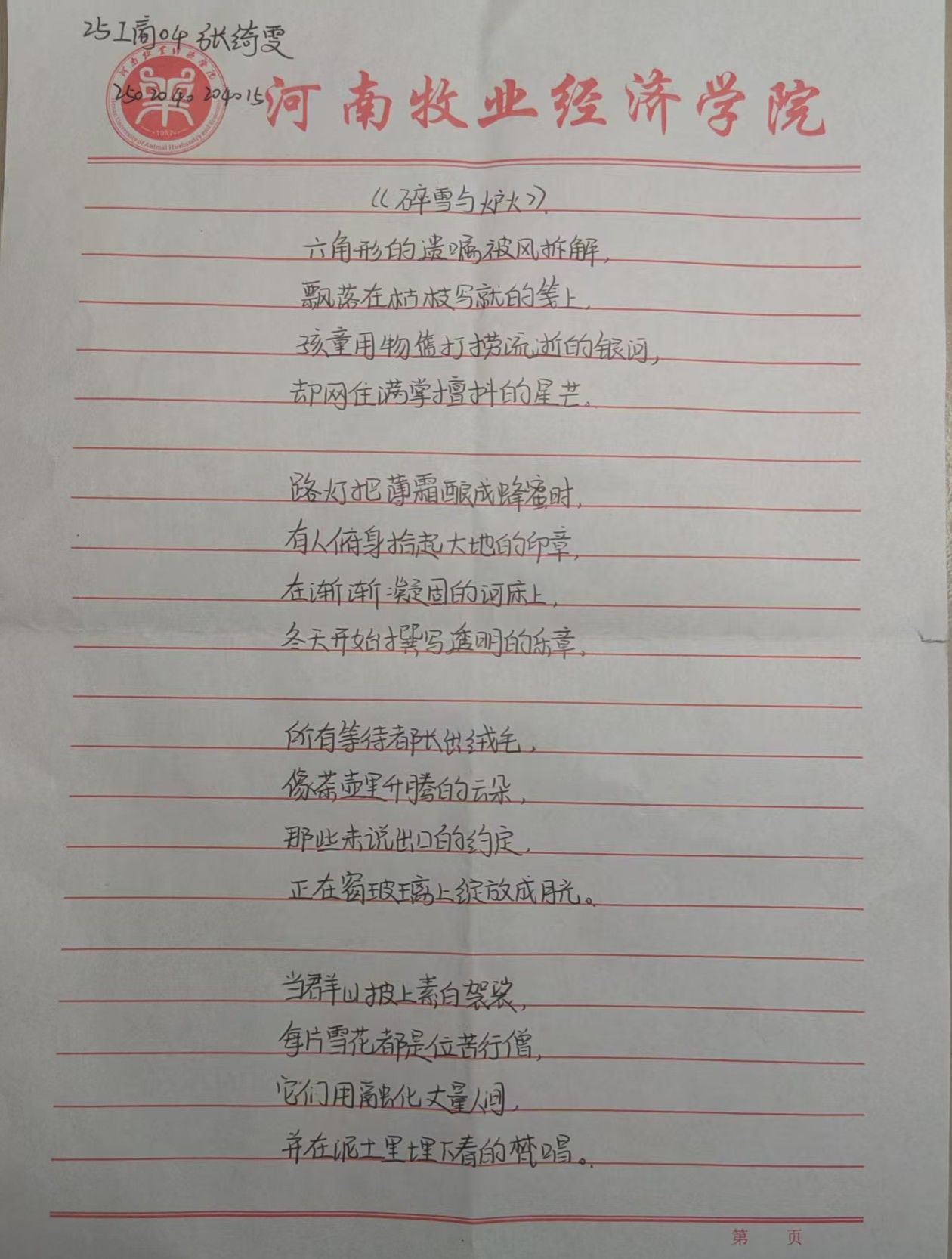 活动期间,同学们积极投入到冬季主题创作中。围绕“冬情”核心,以多元的创作形式表达对冬季的感知与思考,同学们用文字勾勒冬日景象、抒发内心情愫,通过创意设计赋予冬季文化新的呈现方式,将对季节的理解与热爱融入作品之中。在为期三天的活动里,创作热情持续升温,同学们在交流与探索中不断完善作品。收稿环节,同学们有序排队,将手写的诗稿递至工作人员手中,纸张上的字迹或娟秀或洒脱,都裹着对冬日与节气的感知。以古体诗勾勒“小雪檐边凝玉屑”的清冷景致,用现代诗抒发“雪落诗笺时,字里裹着冬的呼吸”的细腻情愫,一张张诗笺纸承载着各异的诗意。同学们彼此之间分享创作心得,交流创作思路,浓厚的文化氛围与青春活力弥漫在校园里,为冬日增添了别样暖意。