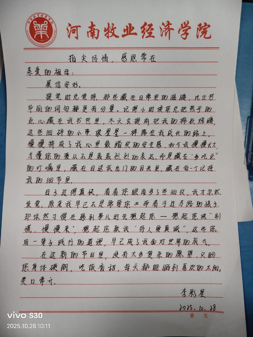 为了配合我院大学生素质养成计划,弘扬尊老敬老传统美德,营造温馨和谐、崇德向善的校园文化氛围,引导同学们以新时代方式践行孝亲敬老之举,ok138cn太阳集团529于2025年10月28日至10月30日成功举办了“指尖传情,感恩常在”活动。