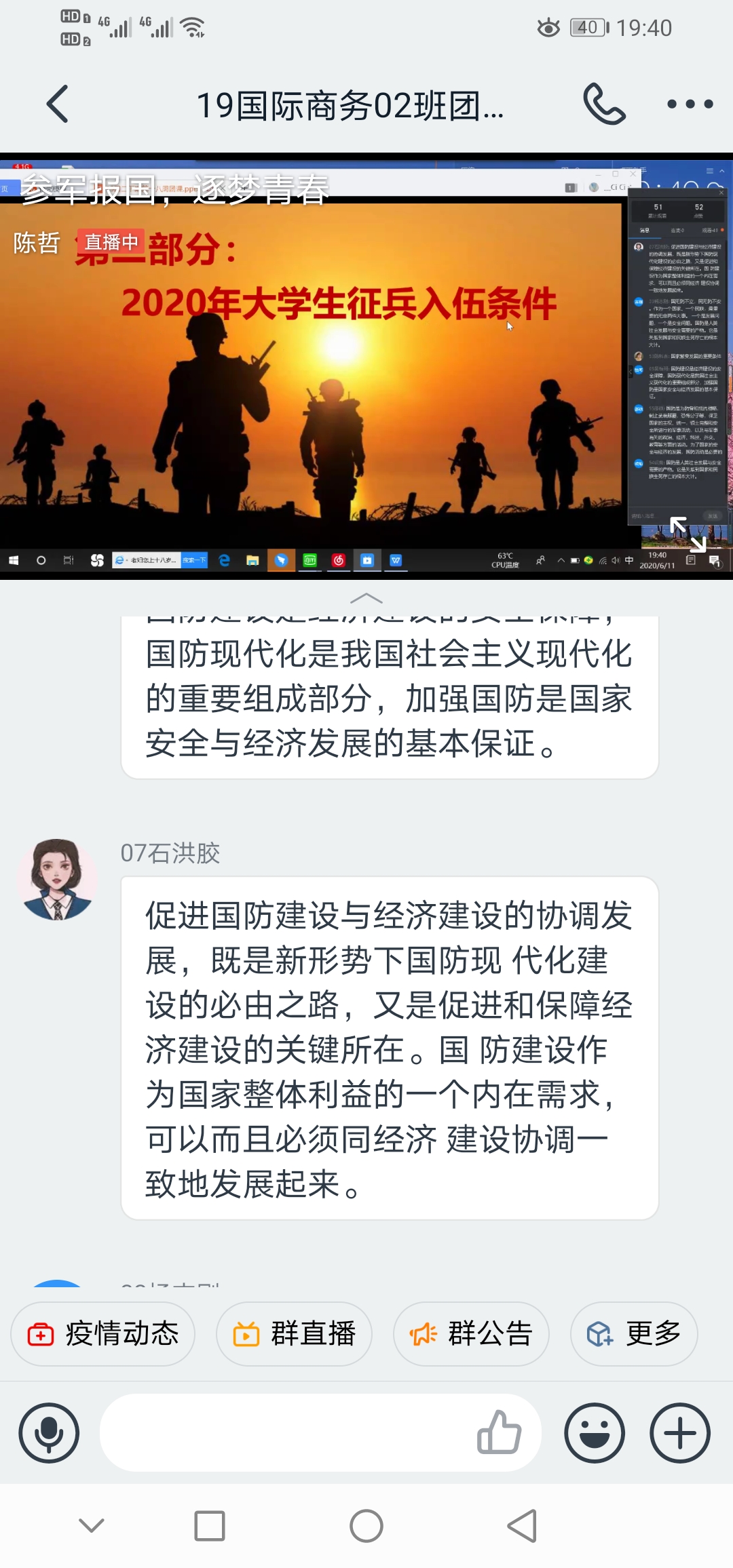 为贯彻落实国家征兵工作,鼓励学生积极参与应征入伍,提高兵员征集质量,推进国防和军队现代化建设。6月11日晚7点30分ok138cn太阳集团529开展“参军报国,逐梦青春”线上主题团课。参加此次团课的有19级400余名学生。