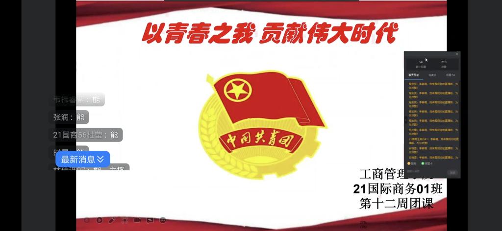 团课伊始,各班团支书带领同学们观看习近平总书记在庆祝中国共产主义青年团成立100周年大会上的重要讲话视频。视频当中习近平总书记强调,追求进步,是青年最宝贵的特质,也是党和人民最殷切的希望。总书记的讲话引发了同学们对祖国贡献青春力量的思考,21工商01班团支书田紫阳表示:“我们一定会牢记总书记嘱托,在党的坚强领导下,以实现中华民族伟大复兴为己任,铭记历史、立足当下,坚守信念、奋勇拼搏,锤炼本领、不负韶华,为建设更加繁荣富强的祖国贡献自己的青春力量!”之后,团员们自发展开“大学生应如何以青春之我贡献伟大时代”的主题讨论,经过讨论大家一致认为:面对百年未有之大变局,当代青年要勇敢担当历史使命,在实现民族复兴的赛道上奋勇争先。最后,各班班长带领同学们学习疫情防控过程中我校涌现出的感人事迹,鼓励同学们向志愿者学习,同时呼吁大家自觉遵守学校疫情防控要求,共同维护来之不易的抗疫成果。