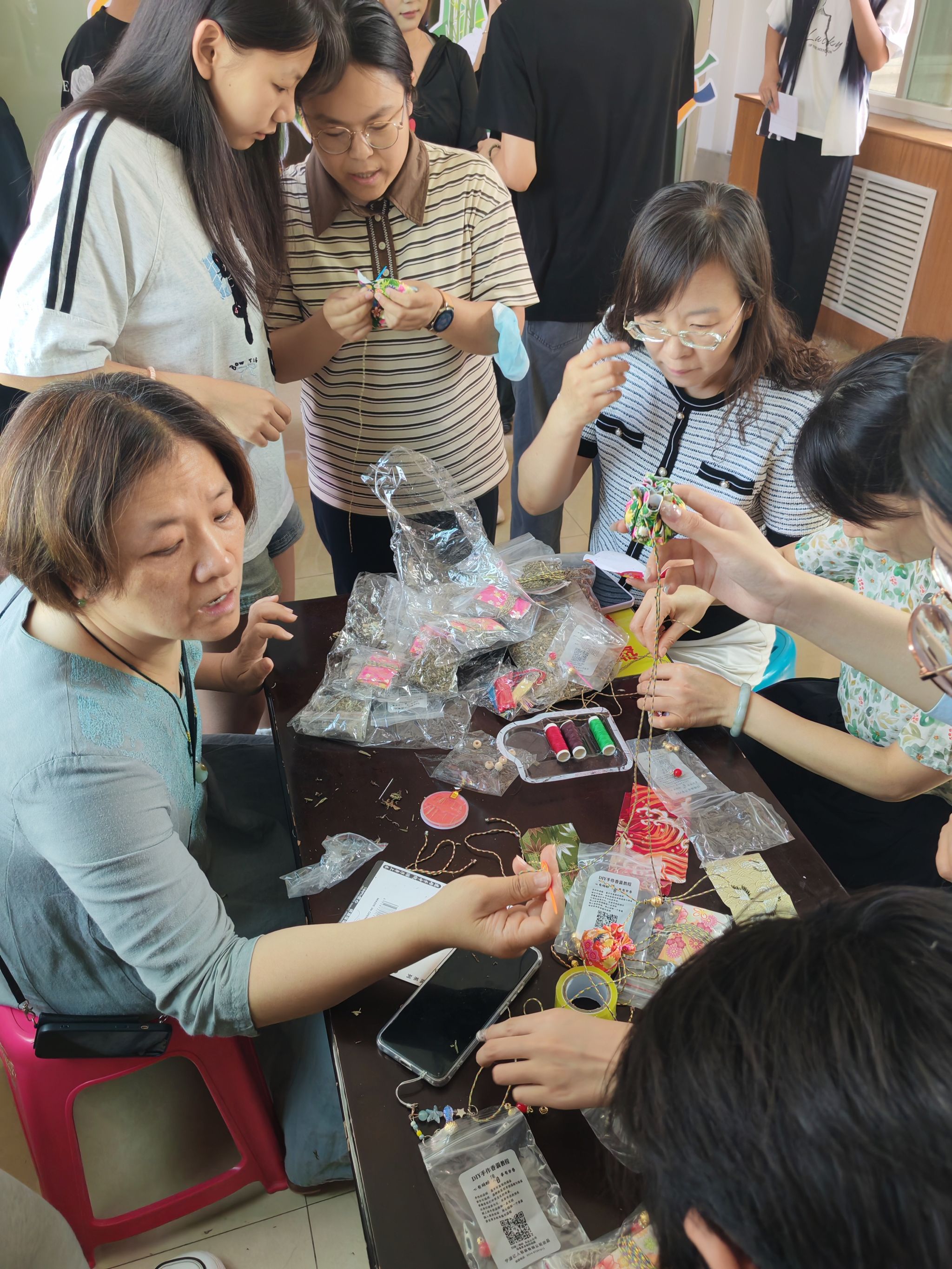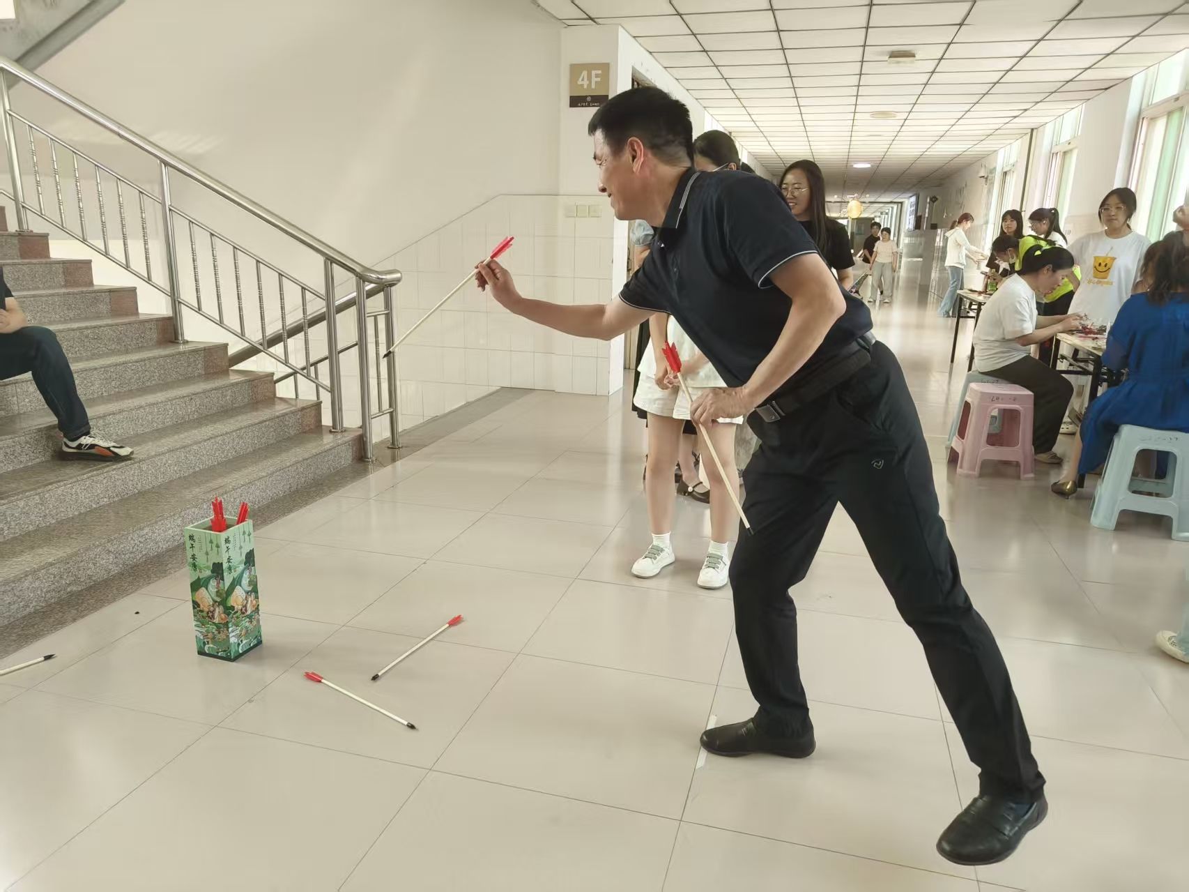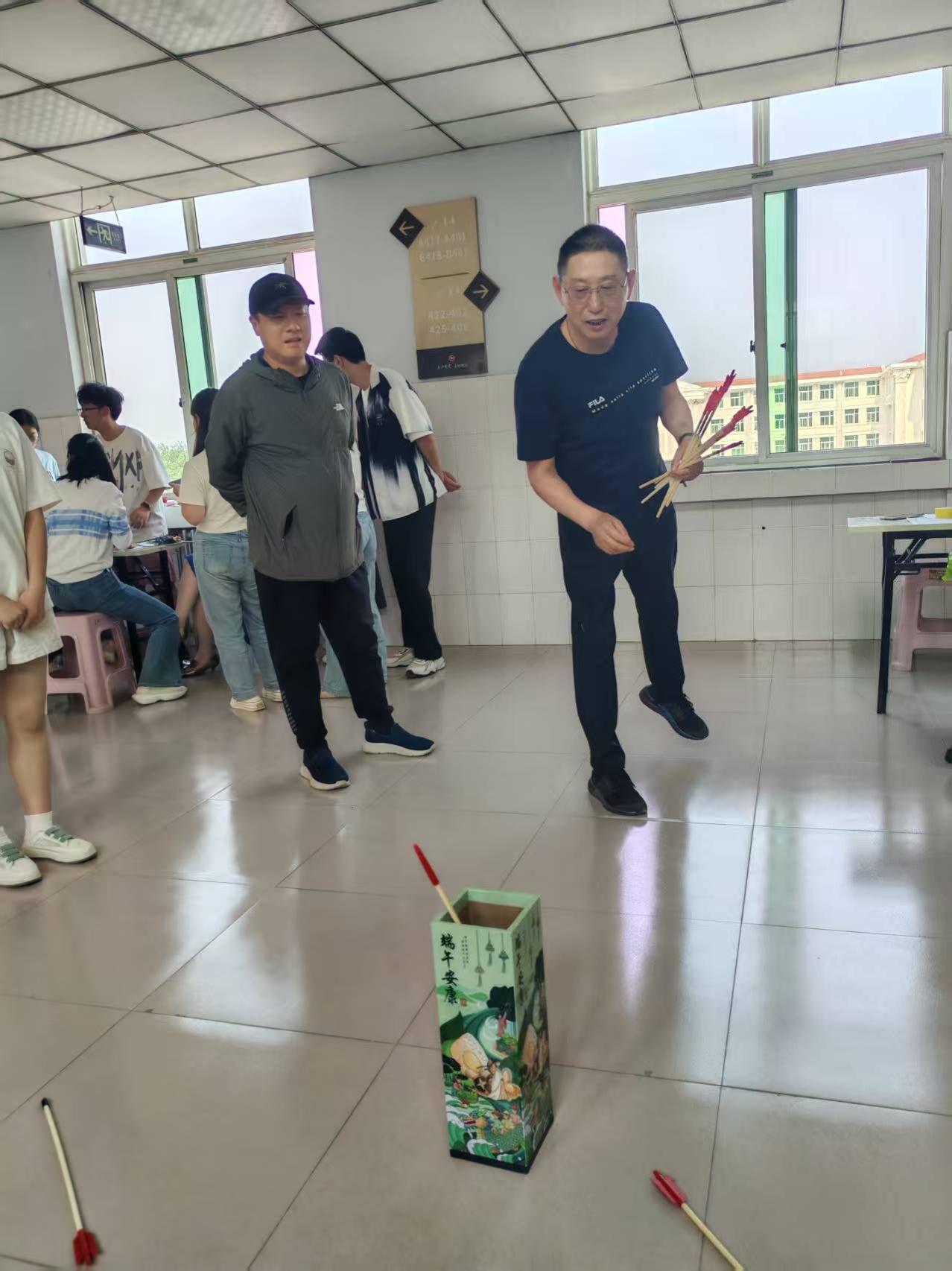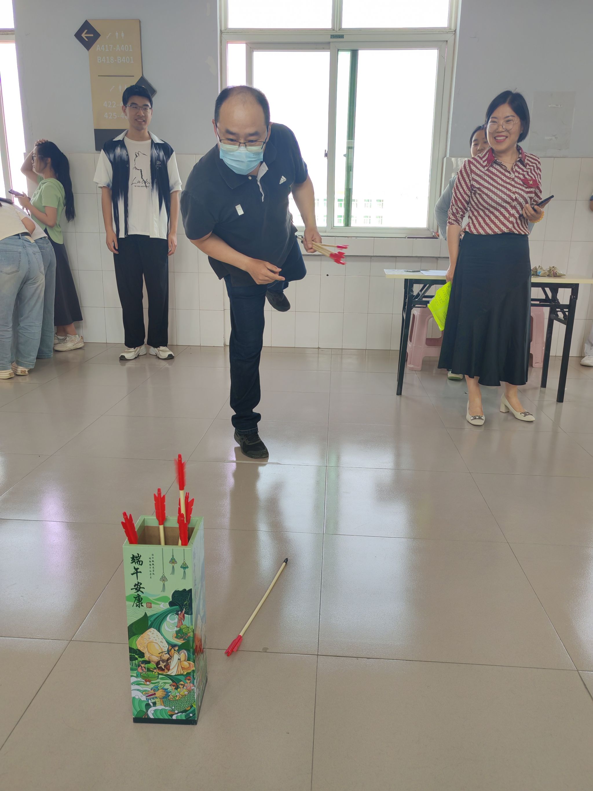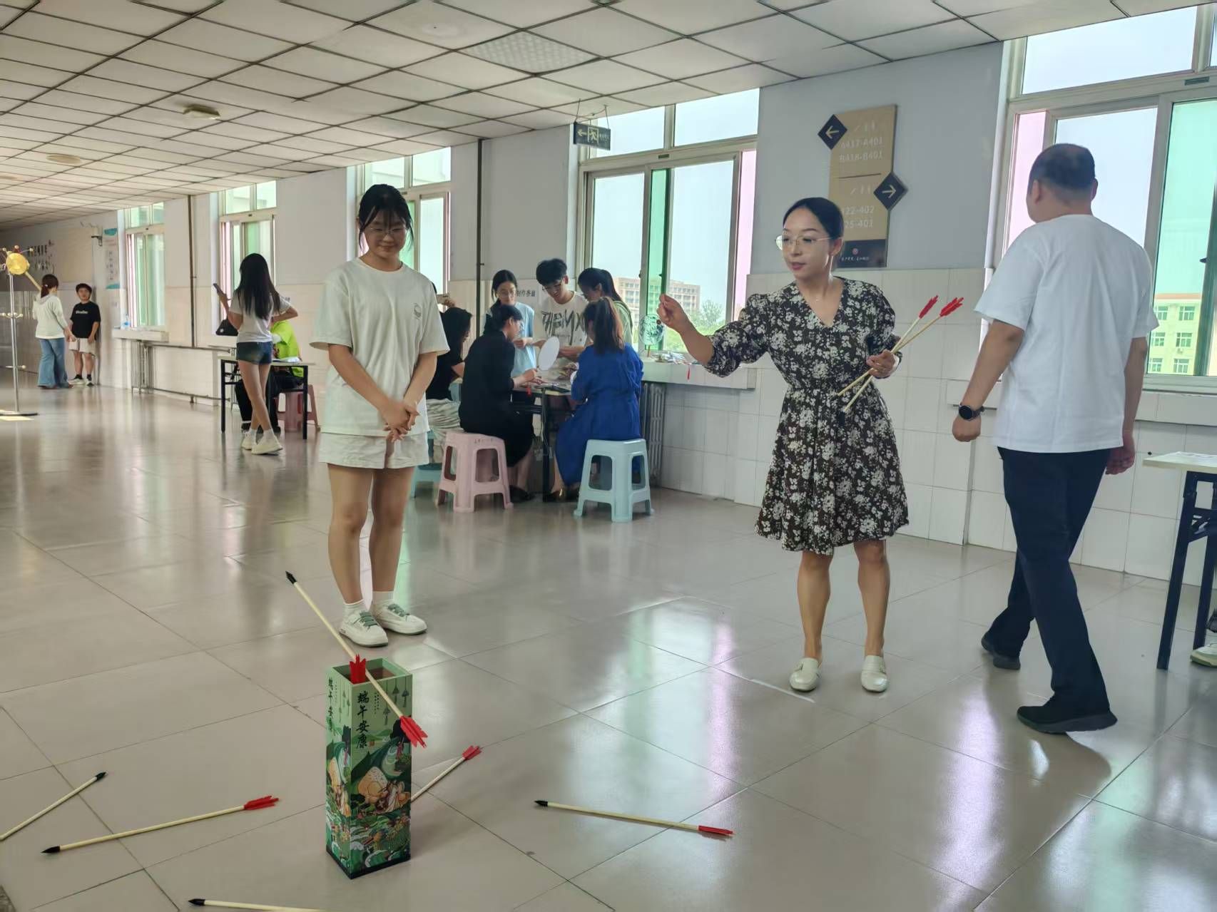 活动现场划分为“匠心”“雅趣”“竞合”三大体验区,60余名师生在协作中深化文化认同:匠心工坊:巧手赋新意。香囊制作区十味草药清香弥漫,教职工飞针走线缝制“安康福袋”。曹迪老师感慨:“一针一线不仅是手艺,更是将‘祈福避疫’的古人智慧传递给下一代。”香扇绘制区,师生以端午草木为题材创作水墨折扇,学院学生志愿者现场指导晕染技法,将“扇引清风”的文人雅趣融入生活美学。古礼竞技:修身强体魄。“射五毒”靶前,弓箭破空直指毒虫图案,寓教于乐传递健康理念;“投壶”区参与者屏息凝神,5箭3中的“雅士”可获得定制书签。学院副院长何丽娜(主持行政工作)点评:“这些项目兼具礼仪教化与体育精神,正是‘着力改善民生’的生动实践。”欢乐协作:聚力润人心。“盲人敲锣”的欢笑声中,同事语音引导蒙眼者穿越障碍;“钓粽子”磁铁鱼竿上下翻飞,团队策略决定积分高低。赵趁老师表示:“协作游戏缓解了近期天天修改毕业论文的工作压力,让我们找回童心,更感受到‘家文化’的温暖。”
