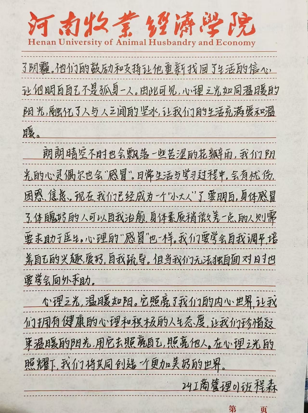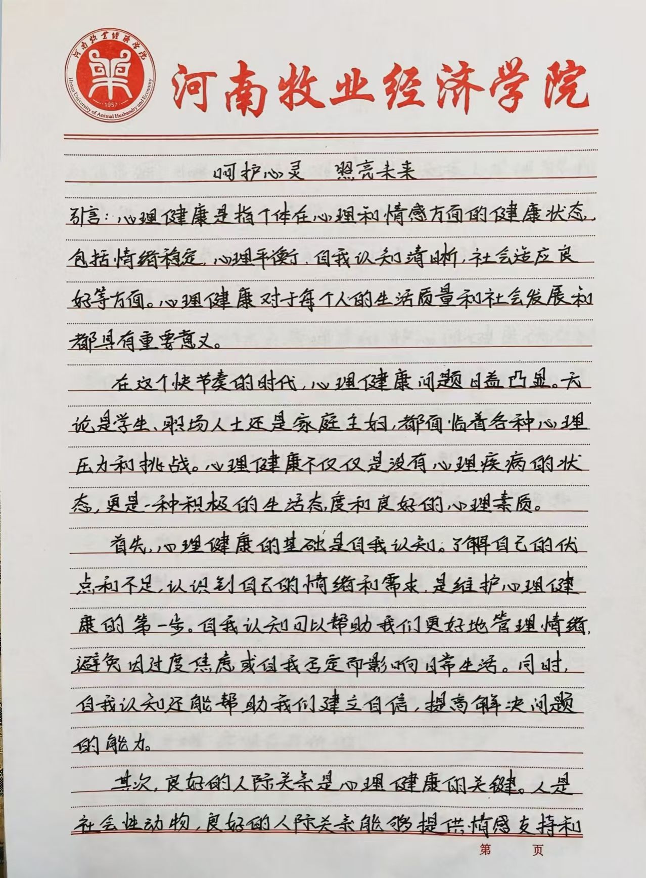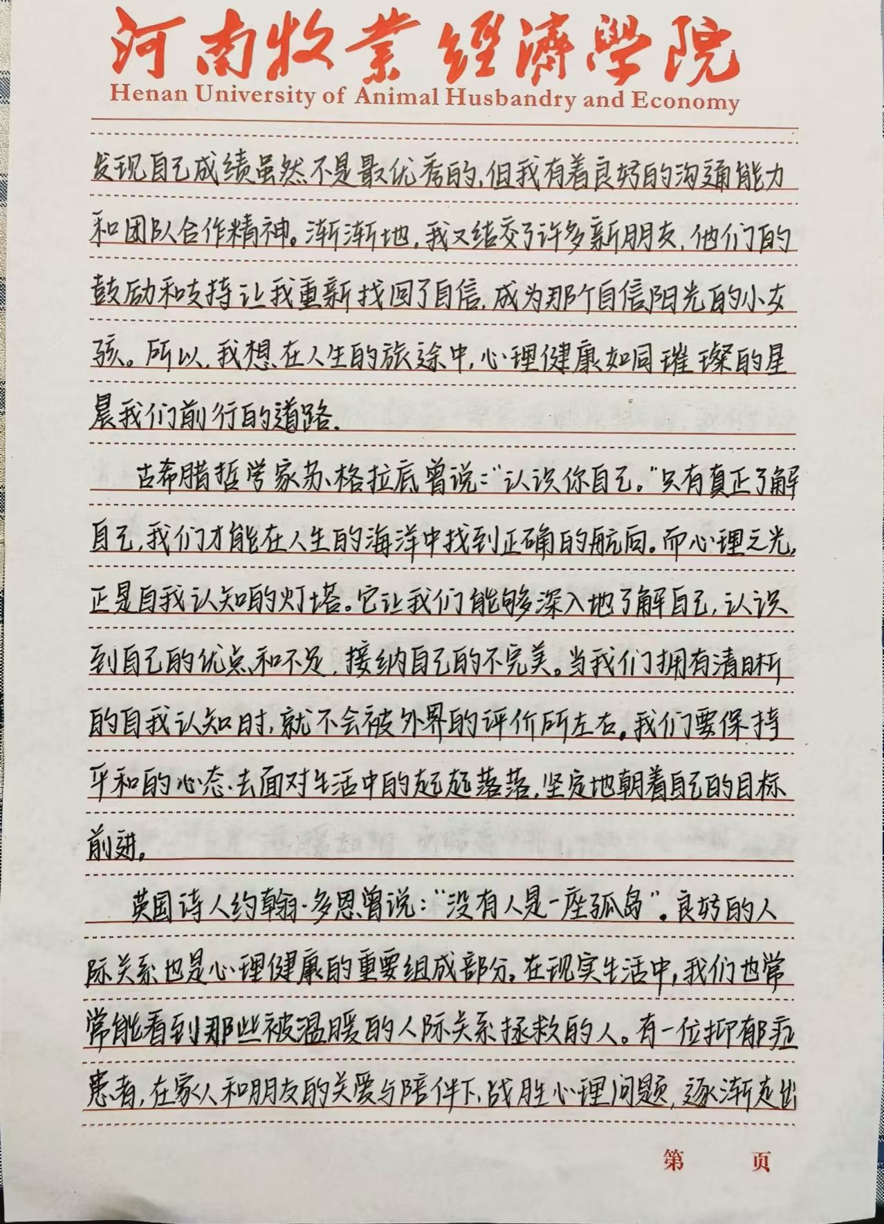 为贯彻落实习近平总书记关于教育的重要论述特别是学生心理健康工作指示精神,普及心理健康教育,提高学生心理健康自我调节能力,引导学生培养积极健康的心理素质,ok138cn太阳集团529于2024年10月15日在全院学生中开展了“心理之旅,温暖共鸣”心理健康征文活动。