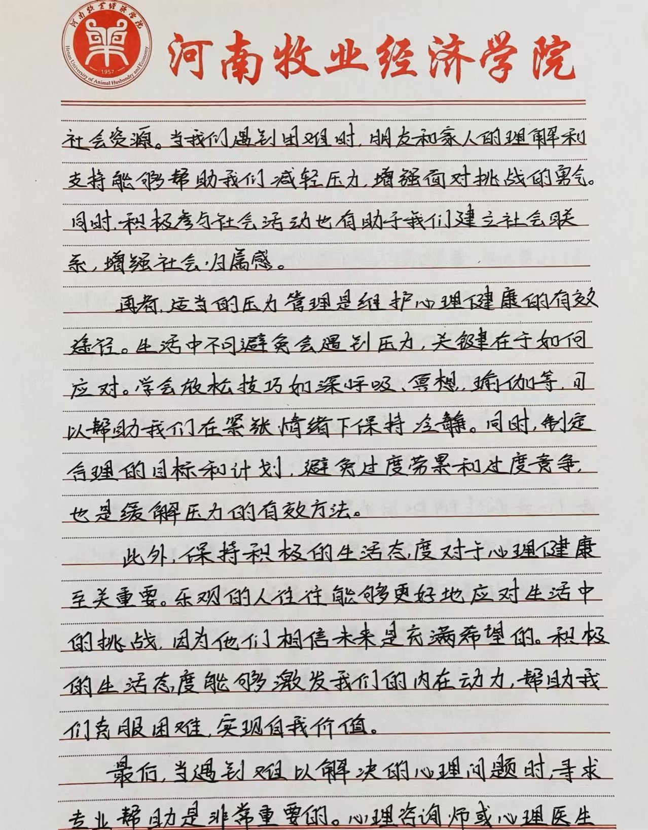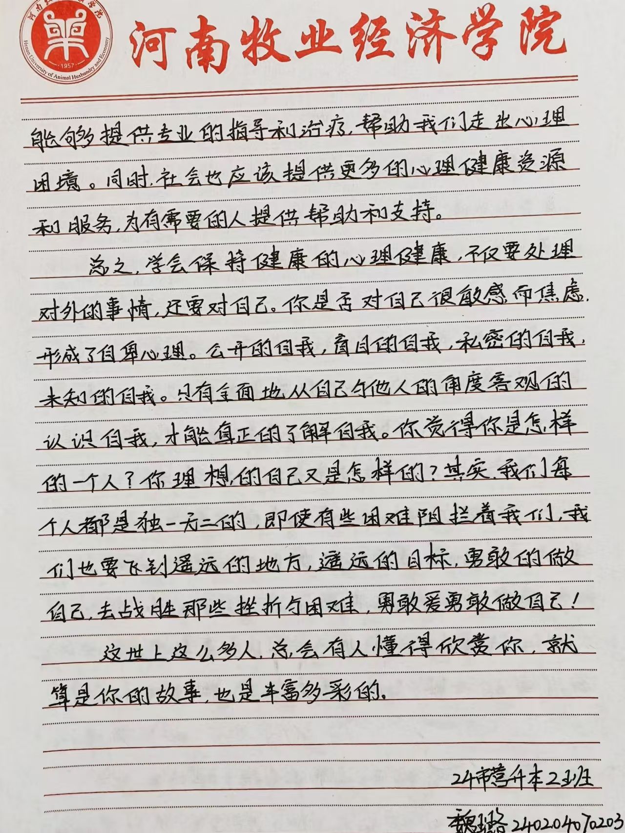 本次活动以“记录心灵成长的脚步,共享情感共鸣的力量”为主题,同学们纷纷拿起笔杆,以文字为媒介,分享自己的心理成长故事和对心理健康的独特见解和深刻感悟。本次活动总共收到个人感悟160多篇,每幅作品不仅文字优美、情感真挚,更在内容上涵盖了心理健康的多个方面,如情绪管理、压力应对、人际关系、自我认知等,为同学提供了一场丰富的心理健康知识盛宴。通过此次活动,不仅展示了同学们的才华和创造力,更在校园内营造了关注心理健康、关爱自我和他人的良好氛围。