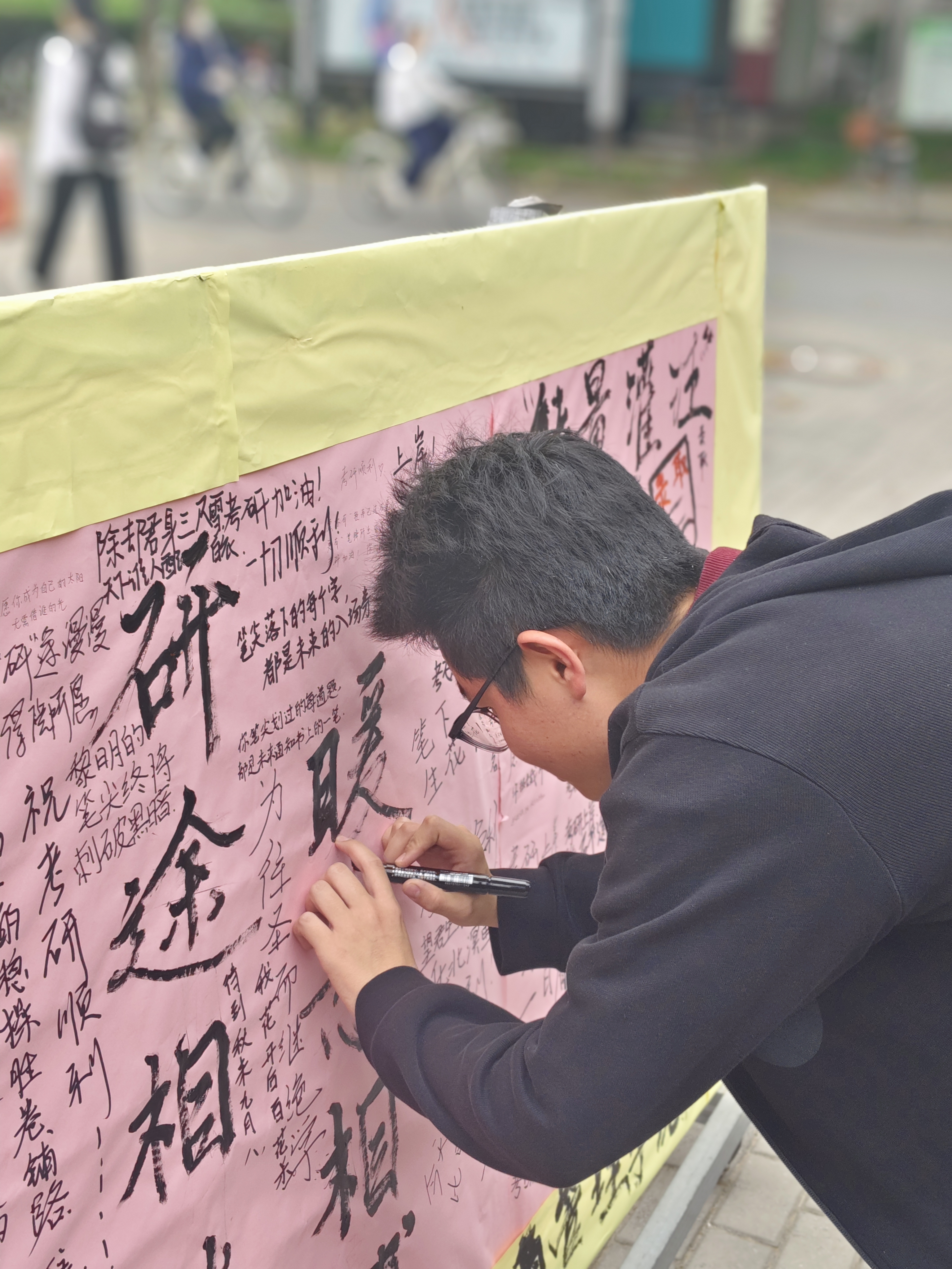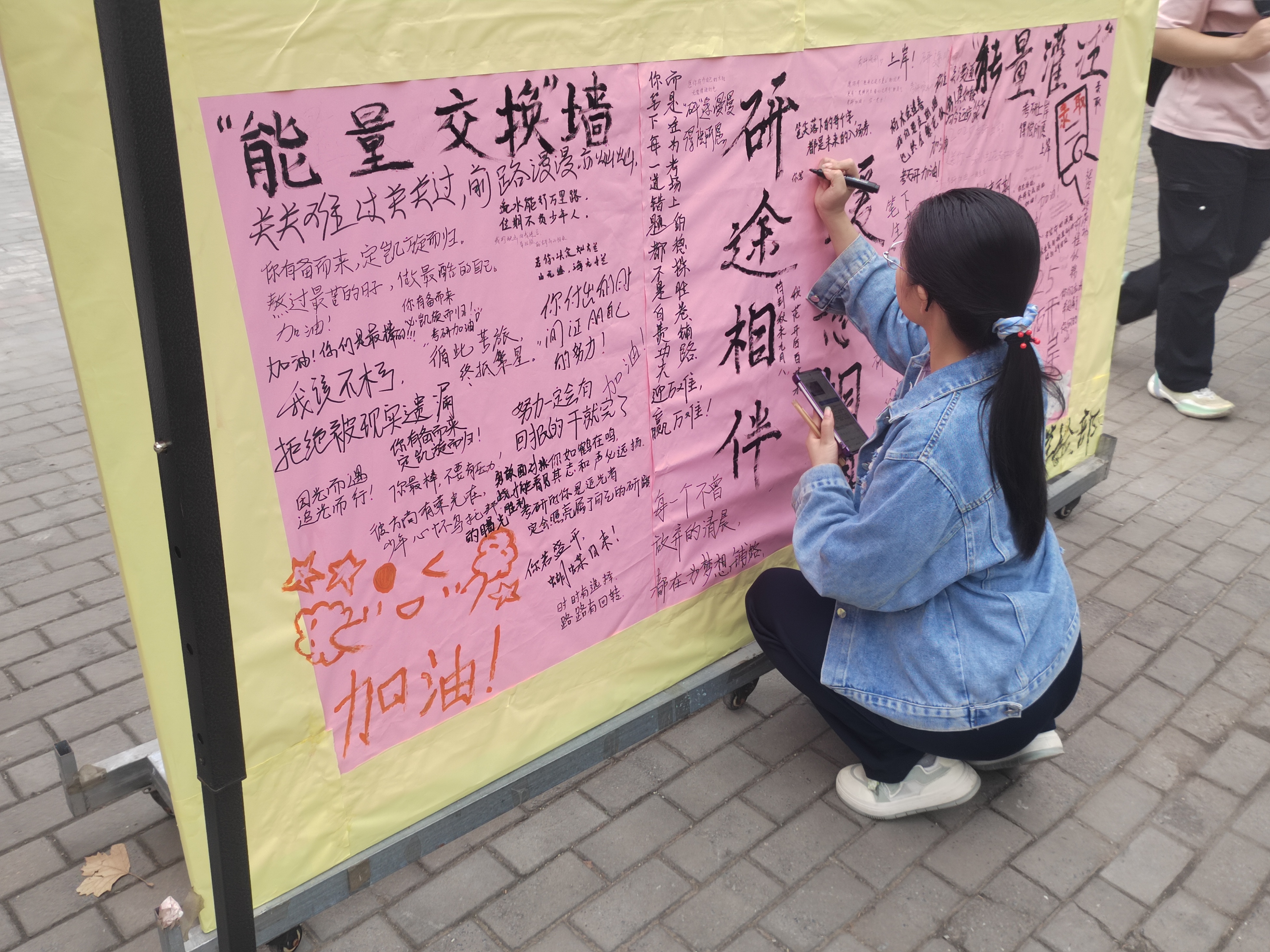 活动现场设立了“能量求充”区与“能量灌注”两个核心板块,吸引了众多同学的热情参与。在“能量求充”区,考研学子们怀着各自的备考心事,纷纷走到展板前,坦诚地写下在备考过程中遭遇的困惑、承受的压力以及内心的烦恼。这些真实的诉求,反映了考研学子在备考路上的艰辛与不易。而在相邻的“能量灌注”区,同样是一派热闹景象。其他同学在了解到“能量求充”区的情况后,纷纷主动参与到这场互助行动中来。他们围绕在展板旁,仔细阅读着考研学子们写下的问题,针对每一个烦恼,写下温暖的鼓励话语,为考研学子们加油打气,还分享心态调整方法,助力他们保持积极乐观的备考心态。展板上,形成了“一问一答”式的隔空对话与能量传递,让每一位参与者都感受到了来自同伴的支持与关怀。