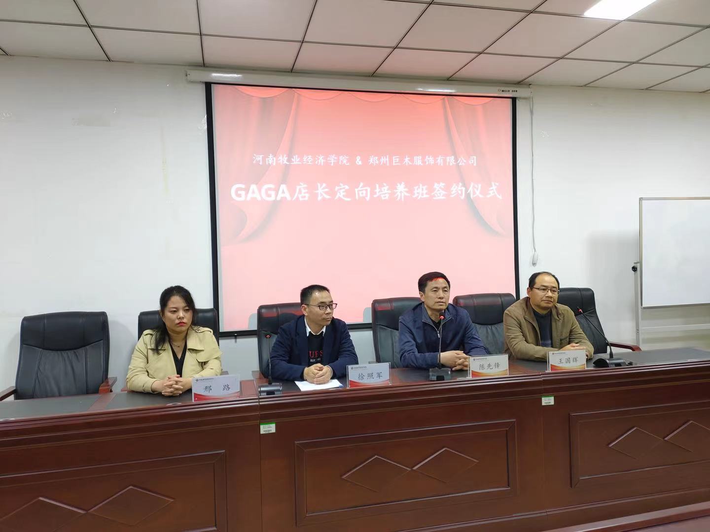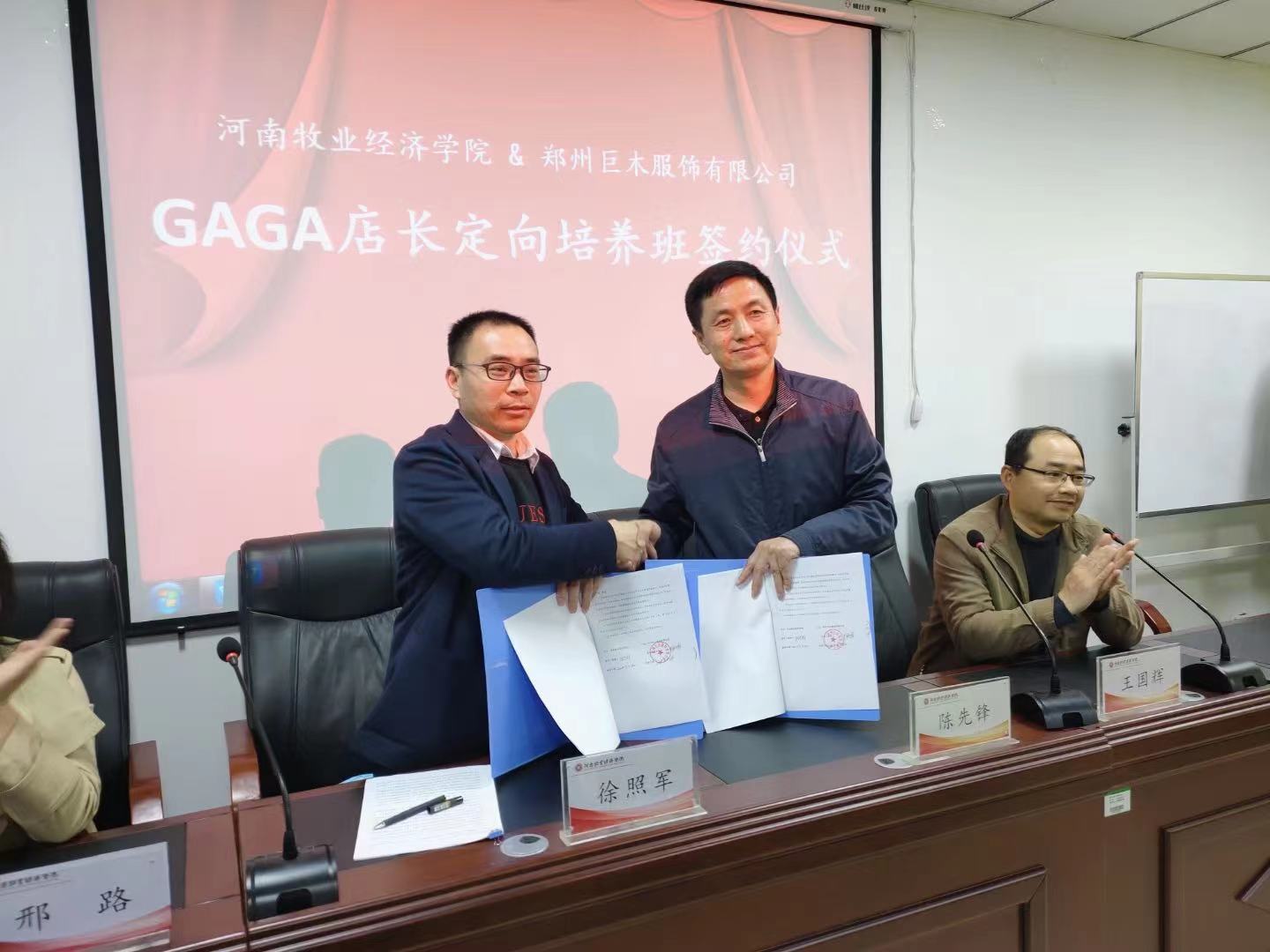 3月26日下午,ok138cn太阳集团529与郑州巨木服饰有限公司成功举行了校企合作签约授牌暨 “GAGA店长定向培养班”开班仪式。副院长陈先锋,副书记王国辉及相教研室老师以及订单班学生参加了开班仪式。我院校友郑州巨木服饰有限公司人力资源副总监徐照军、人力资源经理邢路共同出席了仪式。仪式由连锁教研室主任曹迪主持。