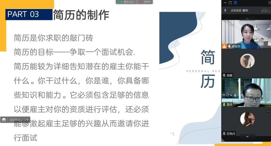 党委副书记詹珅向同学们解读说明2023届毕业生就业政策与形势。以及考公、考编、三支一扶、征兵、西部计划、企业就业等相关政策,强调写好简历的重要性,而后重点说明三方协议以及劳动合同相关内容,叮嘱同学们要重点关注相关就业网站信息,抓住就业黄金期。他还特别强调了毕业实习的重要性、针对性和实效性。并提出及时关注学校发布的就业信息、参加各类校园招聘会,拓宽实习渠道,增加就业几率,积极引入企业专场招聘会和创业平台,为毕业生就业做好贴心服务,对就业困难的学生,建立工作台账,进行一对一的帮扶,提供就业指导和人才培训。