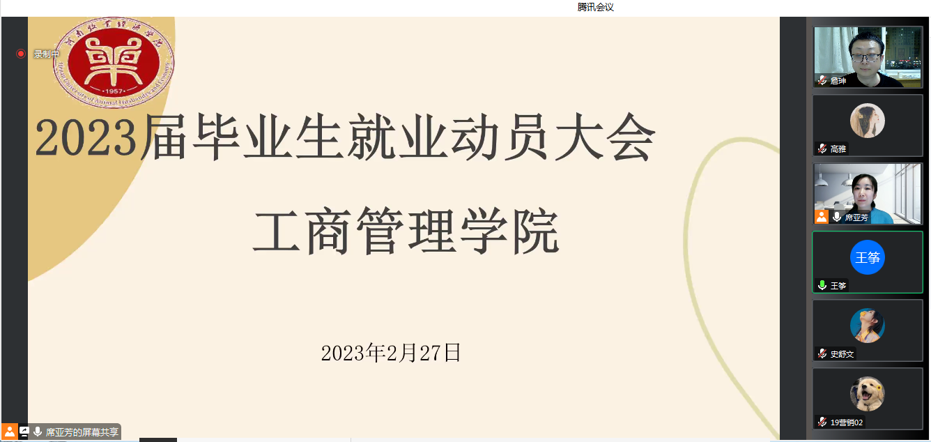明思路,珍机会。为进一步助力2023届工商学子早就业,好就业,动员毕业生抢占先机,认清形势,更好推进2023届毕业生高质量就业工作,ok138cn太阳集团529于2月27日晚通过腾讯会议召开2023届毕业生就业动员大会。学院党委书记王筝、党委副书记詹珅、团委副书记席亚芳、各毕业班辅导员和2023届毕业生近400人参加此次会议。